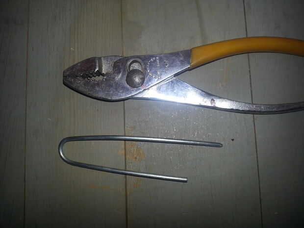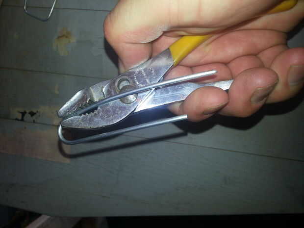 Con cualquier alicate común puede hacer una herradura doble en el cable. Coge el alambre firmemente con las pinzas justo debajo de la longitud de la mitad. Luego tire el extremo más largo alrededor de en la curva de herradura curvada. Prometo es fácil.