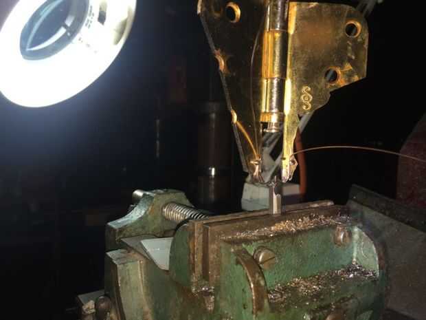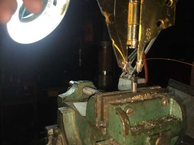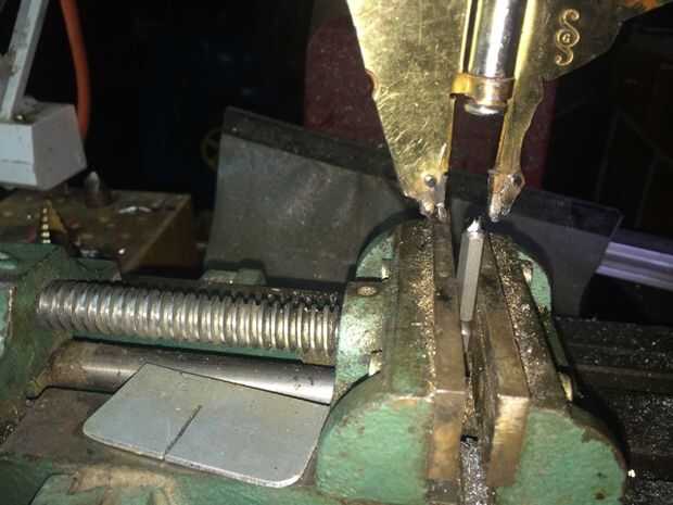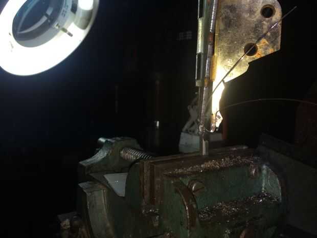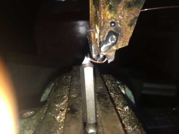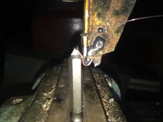 Aquí está un bosquejo áspero de un método de doblar el gancho en un solo movimiento. la parte superior es una bisagra de la puerta con el pasador de pivote en el mandril del molino. los pasadores (talones de spike) en las extremidades más bajas el alambre del gancho agarrador y fuerza en la espiga del centro en la prensa. Cuando el alambre empieza a doblarse hacia abajo, las mitades de bisagra giran hacia los demás y forman los dos lazos del gancho, la Asamblea entonces cae contra un jefe debajo de la patilla central para formar la parte posterior de la curva en el gancho.