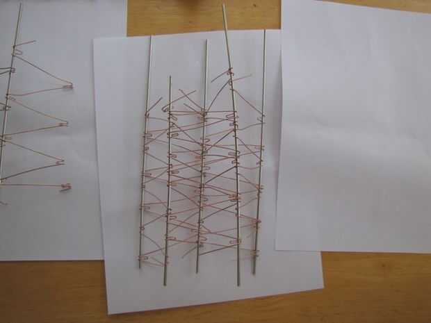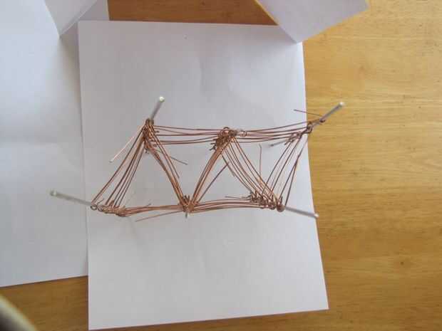 Así todos los cables rectos tres ahora se mantienen en su lugar por una serie de webs que se enclavija, proporcionando una cercha de dimensiones equiláteros.