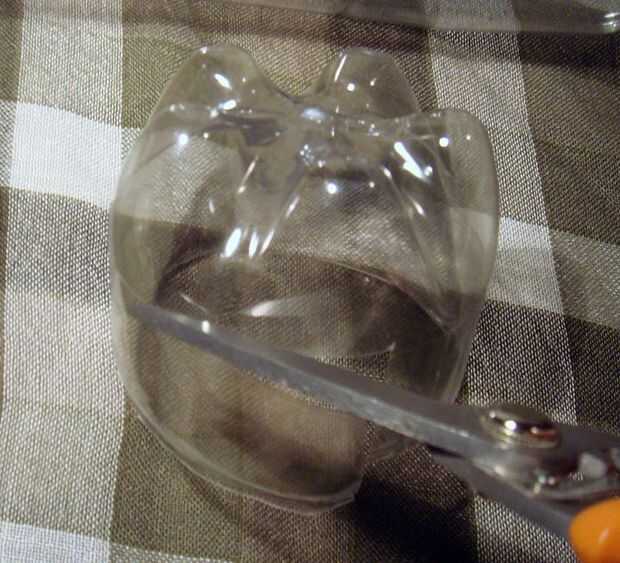Corte ahora, otra vez, diagonalmente y luego horizontalmente a lo largo de la parte de botella de plástico. Qué debe dejarse es una forma de la flor.
