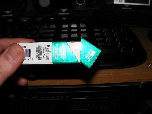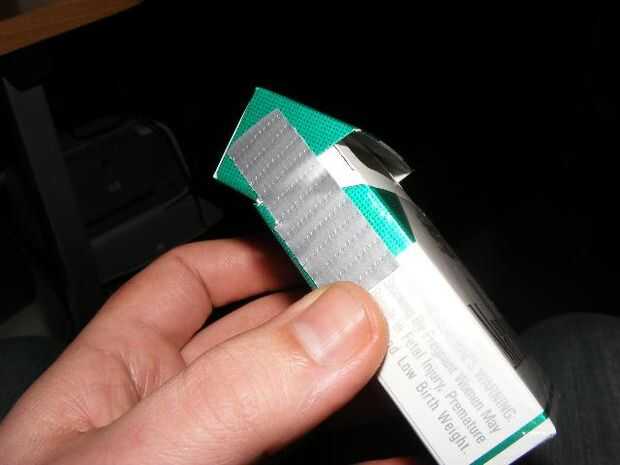 Si usted mira de cerca la tapa de un paquete de cigarrillos te darás cuenta de se corta a un ángulo de 45 grados. Cortar 2 tiras pequeñas de cinta adhesiva. Abra el paquete del cigarrillo 45 grados. Está abierto a la derecha del ángulo cuando el la parte inferior de la tapa es en ángulo recto al borde de la manada. La tapa en posición con las tiras de la cinta. Usted notará que la tapa ahora forma un bonito labio para fijar tu Gadget.