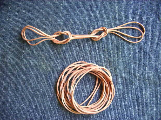 De si uno tiene cuidado no tirar a la basura las banditas de goma vienen con los paquetes o con las pizzas, al cabo de un tiempo sí una buena colección. Yo tengo la suerte de conseguirlas por otro medio, pero no tuve ir a comprarlas. En este caso, como la gomera será para una de mis pequeñas nietas, usaré solamente cuatro banditas de goma largas, dos para cada lado. Si tú quieres más fuerza, usa todas las banditas puedas estirar cómodamente. Incluso puedes encadenarlas fácilmente entre sí, si no son suficientemente largas, como ves en la foto.