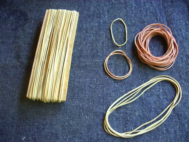 Si tiene cuidado de no tirar las gomas que vienen con paquetes o pizza, después de un tiempo que tienes una buena colección. Tengo la suerte de conseguirlos de otra manera, pero no debía ir a comprarlos. En este caso, como la Honda será una de mis nietas pequeñas, se usan sólo cuatro grandes bandas de goma, dos para cada lado. Si quieres más potencia, usar todas las bandas que se pueden estirar cómodamente. Incluso usted puede fácilmente cadena les juntos, si no son lo suficientemente largos, como ves en la imagen.