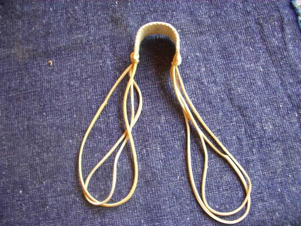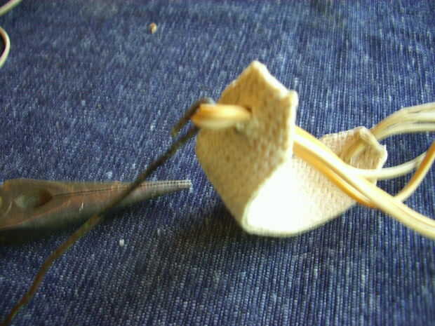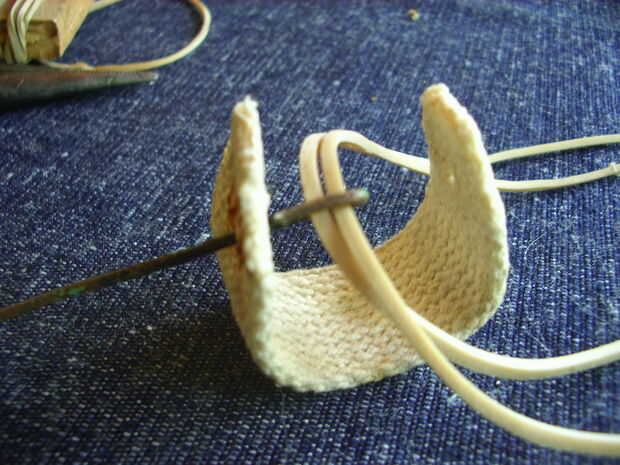 Hay que fijar primero las bandas de goma a la correa del paso 4. Puesto que los agujeros que hice en el pedazo de correa son pequeños, ayudarán con un gancho de alambre a las gomas del hilo de rosca. Después de pasar la punta de un par de ellos a través del orificio, enrosque el otro extremo en su interior, para conectar las bandas a la pieza de la correa de.