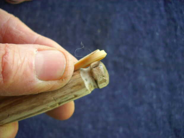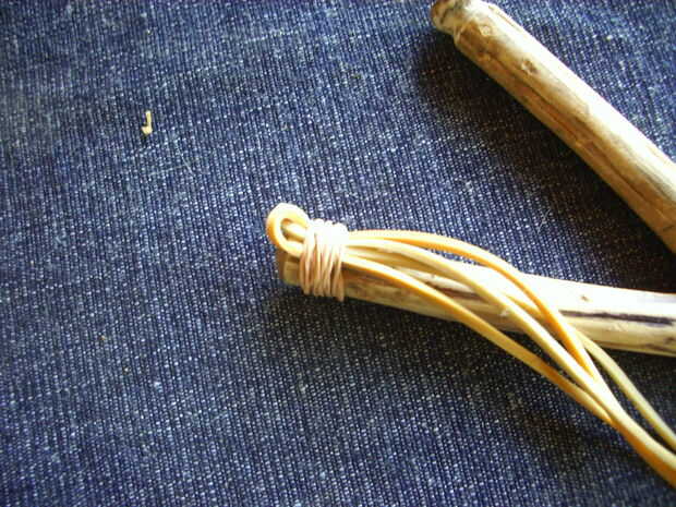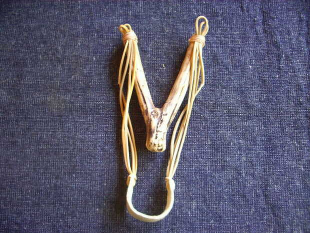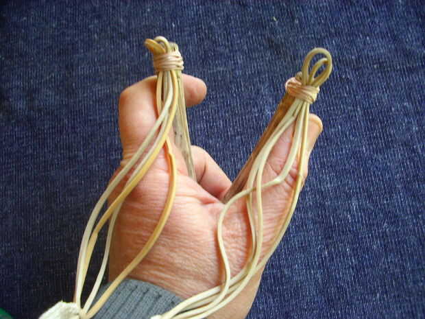 Ahora hay unir los extremos libres de las gomitas a la horqueta, sobre las muescas hicimos en el paso 2. Lo haremos con otra bandita, una para cada lado. Hay tratar de todo quede del mismo lado de la horqueta, y las gomitas impulsarán el proyectil queden del mismo largo. Por esa razón, en la foto de la gomera nueve se ve la rama derecha de las gomitas sobresale un poco más la rama izquierda.
