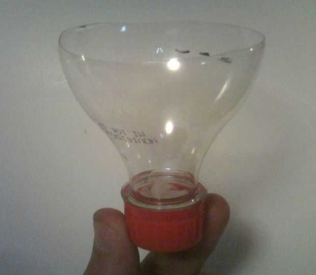 Ahora tijera la parte superior de un litro de la botella, para hacer un kewt poco embudo. Calentar la aguja y meter un pequeño agujero en la tapa. Todavía goteo demasiado rápido, así que arrancar algún filtro de café y cosas dentro de la tapa, para impedir el flujo. Usé la mitad de un filtro, mirado para arriba, para obtener una tasa de goteo de un goteo cada cuatro a cinco segundos. Había medido hacia fuera 6oz de agua, llena el embudo y había marcado el embudo para llenado fácil.