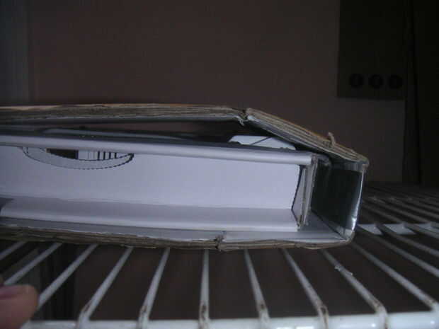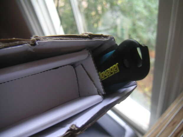 a continuación, envuelve el cartón alrededor de la LC y grabado de una manera que dejó una agradable pequeña área para tabulación de bolígrafos o lápices USB o lo que sea. Ayuda a las arrugas a lo largo del borde posterior donde debe doblar para abrir. La batería grande hace mina de palillo para arriba un poco, así que creo que voy a añadir otra capa de cartón más adelante.
