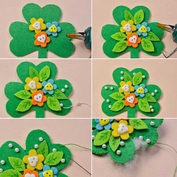 3, hilo de algodón blanco pase a través de una aguja, luego coser las perlas 6mm blanco en la hoja de fieltro verde por separado;