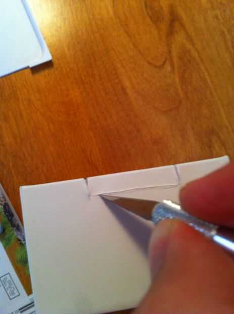 -Después de cortar dos ranuras en el caso, comienzan a marcar la parte inferior del agujero hasta que por fin empiece a crear un bosque para deslizar la hoja entera en. Una vez más su más fácil si usted apriete las dos cajas juntos durante el corte para evitar deformaciones.