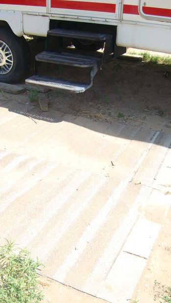 Otra opción de caminos a pie es laminado en techos.  Guarda las hierbas y tus pies secos.  Mi vecino se iba a lanzar este viejo material para techos, y sugerí que usar delante de su puerta de trailer viajes para un felpudo.  Me ha funcionado muy bien.  Usted sólo laicos las piezas hacia fuera y superponen en un día de cálido sol y el calor del sol derrite los juntos.  He visto donde personas han utilizan esto para sus rampas.  Vea la foto.