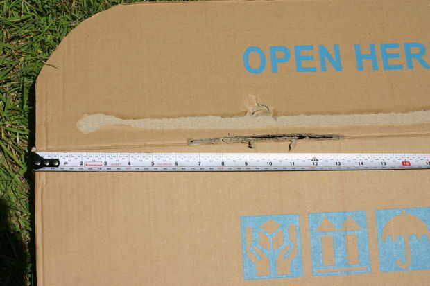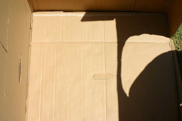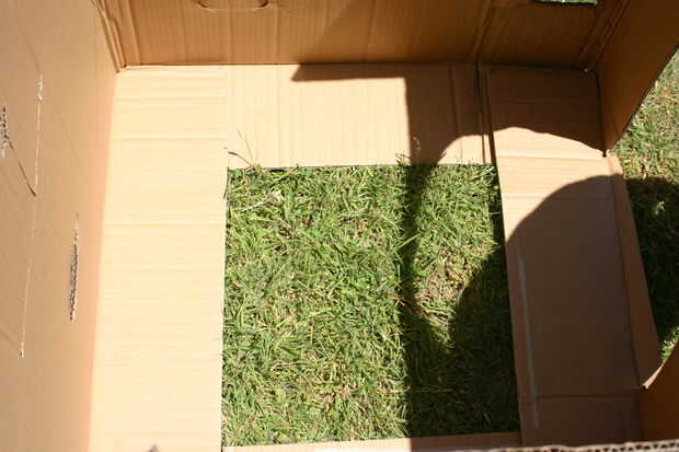 El techo es la parte difícil ya que tendrá cuatro ranuras de cortan en los puntos se deslicen sobre las solapas superiores en las paredes. De esta manera no necesita cinta para sostener el techo. Las ranuras deben ser la misma distancia aparte, anchura sabia, como sus paredes. Mina eran 30 pulgadas que por suerte era igual a la altura de la caja, así que podía usar los pliegues de las aletas como una guía. Corte mi ranuras corto poner el techo en la parte superior las paredes y corte las ranuras más, hasta que el techo sentó lo que quería. También doblé las esquinas de la azotea para ser amable con las cabezas de los niños que sin duda en él.