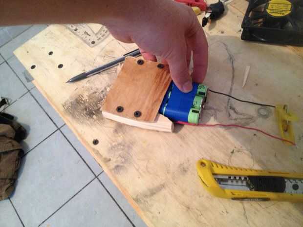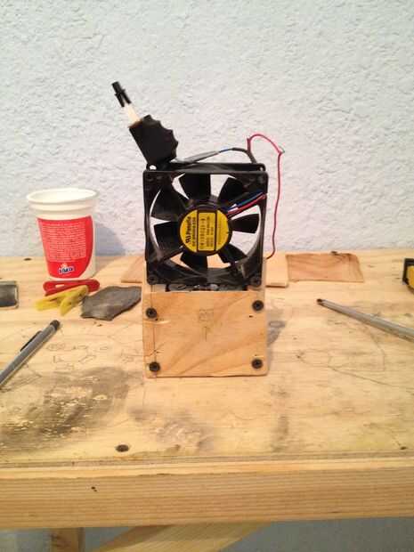 Ahora Conecte el cable negativo de la batería al negativo (negro) del ventilador. Asegura que el alambre son seguro y no serán absorbidos en el ventilador. El cable positivo debe tener algún tipo de estancia fácil encendido (STSP). Primero usé un gran interruptor que obtuve de un juego de DVD. Funcionó bien pero era demasiado grande y siempre estaba en el camino. Por ahora yo sólo uso una pinza tan puedo fácilmente conectar y desconectar los cables. Es muy importante que el interruptor no se enciende en le bolso. Podrían dañar el ventilador y baterías. Estaba preocupado por esto pero ahora la pinza hace muy poco probable como que estoy separando los cables.