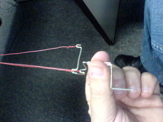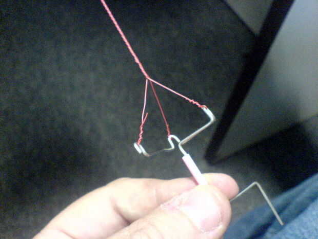 Ahora, mantener la plantilla por el agitador, tire de los cables un poco tenso y girar el mango con la otra mano. Continúe a girar hasta alcanzar la tensión deseada. Tenga cuidado de no retorcerlo firmemente que rompen los cables. Cuando termines y soltar la manivela, a descansar un turno o dos debido a la tensión, pero los alambres torcidos a permanecer juntos.