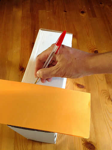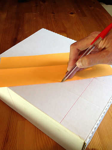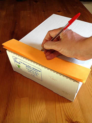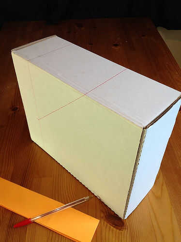 Lo primero es marcar la línea de corte en el frente. Esto puede hacerse en 4,25 pulgadas o 105mm de la parte inferior. La forma más rápida de medir esto es doblar una hoja de papel lettersized (8.5 "x 11" o A4) en mitad del camino largo. Luego sosteniendo la hoja plegada contra la caja de lado y alineada con la parte inferior dibujan la línea. Ver foto 4 y 5