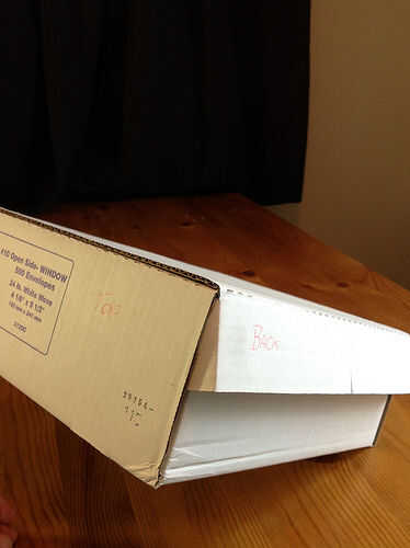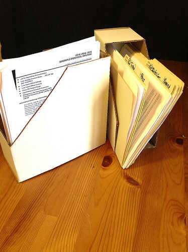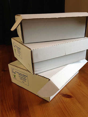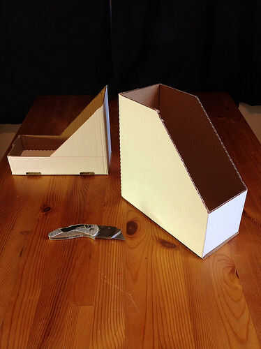 Cajas sobres desechados son perfectas para esta tarea. Las cajas que buscas son los utilizados para empacar sobres de carta tamaño #9 y #10. Estos mantener 500 sobres por caja y la casilla de tamaño estándar para sobres impresos comercialmente en América del norte. Otros países deberían tener algo comparable. Mejor apuesta es buscar en almacenamiento estacionario en la oficina. Ver foto 2