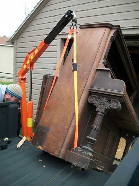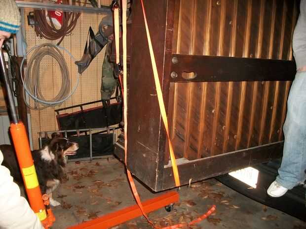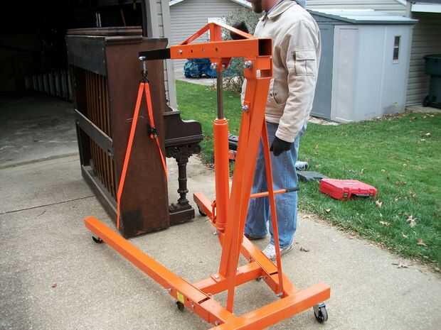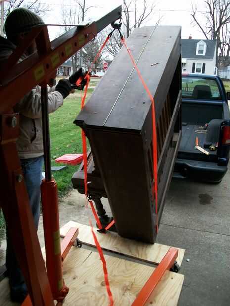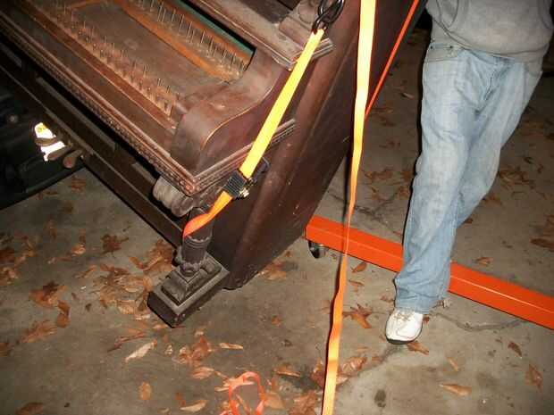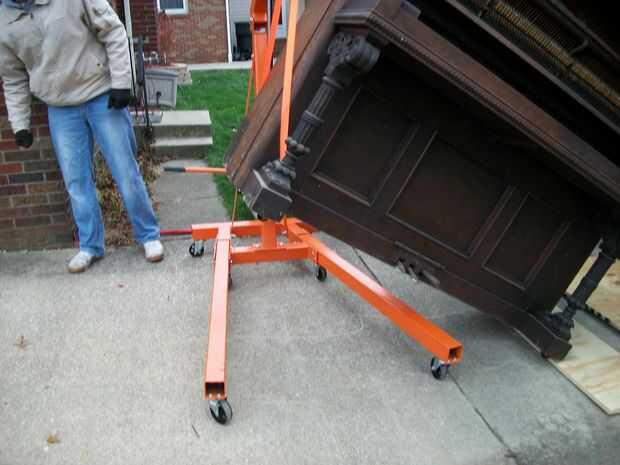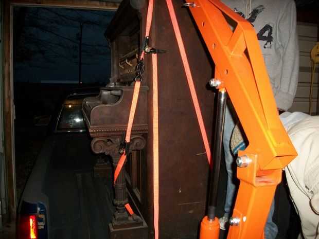 Asegúrese de que todo su hardware puede manejar el peso que va a levantar. Este piano pesa entre 450 y 700 libras. Mi correas del trinquete son nominal de 4.000 lb y el brazo de elevación se establece en 1/4 tonelada (500lb) y dado que sólo estoy elevación de un lado a la vez es dentro de este límite, así.