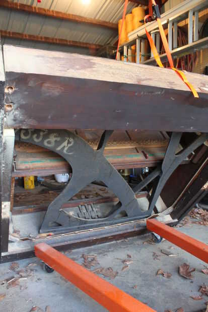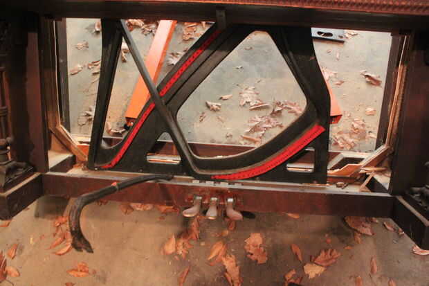 Me enteré de la manera más dura que la parte superior de la arpa está muy bien montada a tablas de arce duro por bastantes tornillos grandes de cobardes que el metal es lo suficientemente suave como para hacer pesar usando el tamaño incorrecto de destornillador. Además de eso, cada uno de los 184 tuning pins plantado firmemente en dicho Comité hacer casi todo intento de remover el arpa de su placa de soporte imposible (falta quemar el piano que había reflexionado sobre un par de veces por este punto). Este dicho es mucho más fácil cortarlo todo y desmontar la caja-como la estructura de la abrazadera superior sobre el piso.