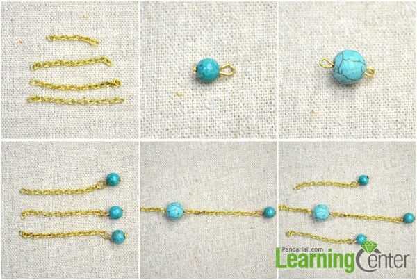 5, coloque las tres perlas de 4mm al final de las cadenas de tres 4 cm por separado;