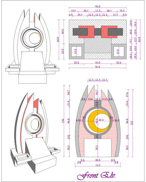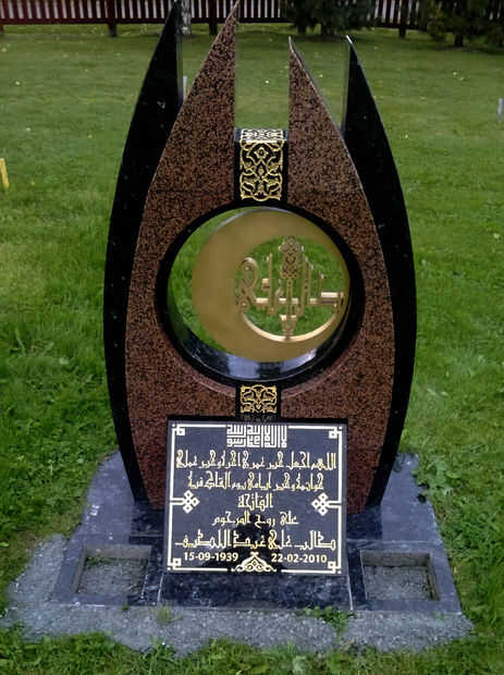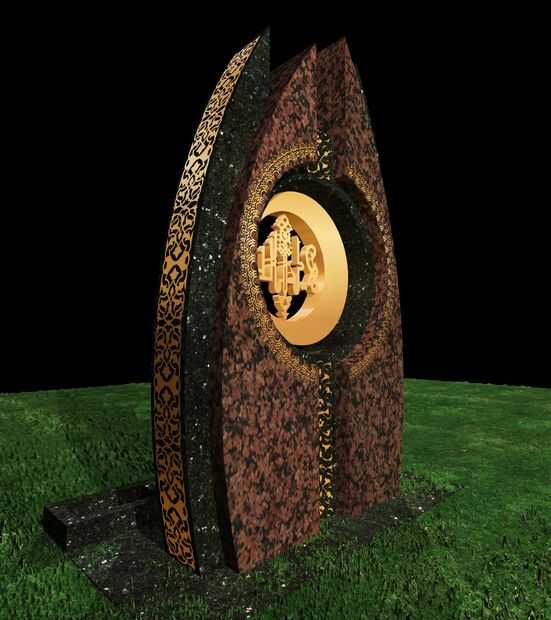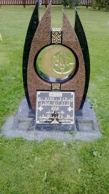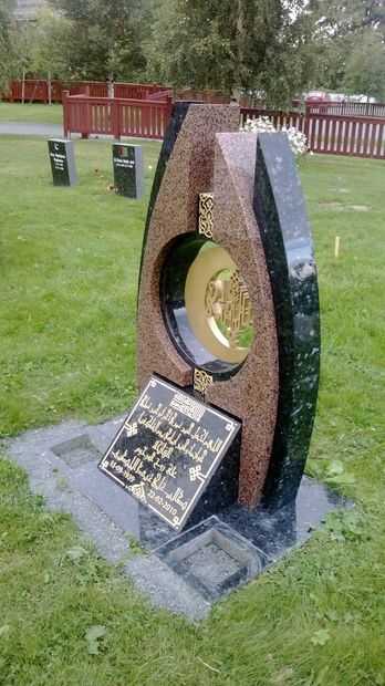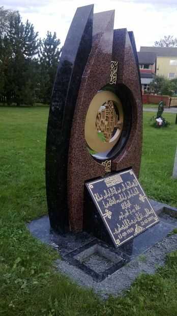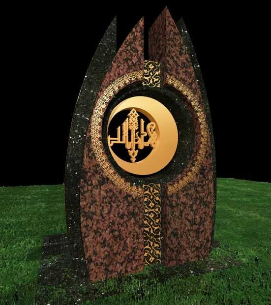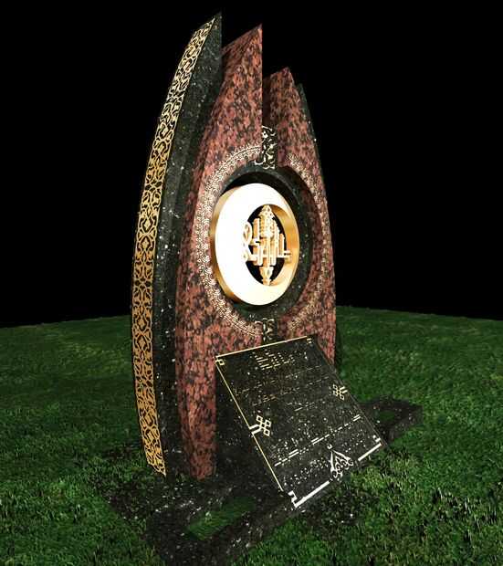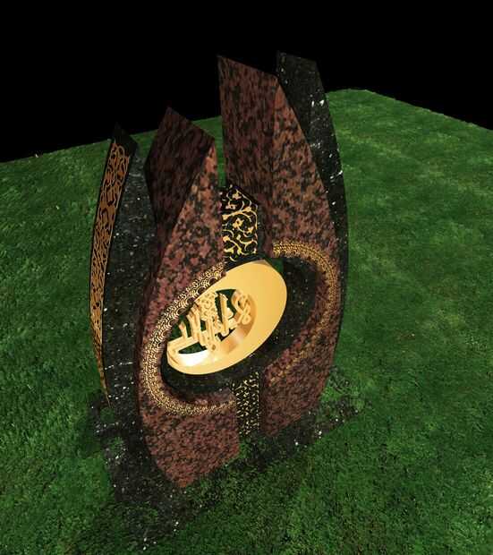 He intentado hacer una indicación del alma por la apertura en el centro; regresar al cielo. Y el nombre de mi hermoso padre que en forma de caligrafía árabe en la media luna (media luna) dentro del monumento. Las alas que forma el monumento desde el exterior da una indicación de la bondad que tiene mi padre hermoso. Y la idea principal que he intentado usar en este monumento es la franqueza y la simplicidad.