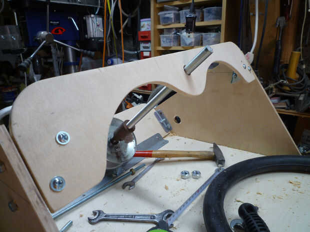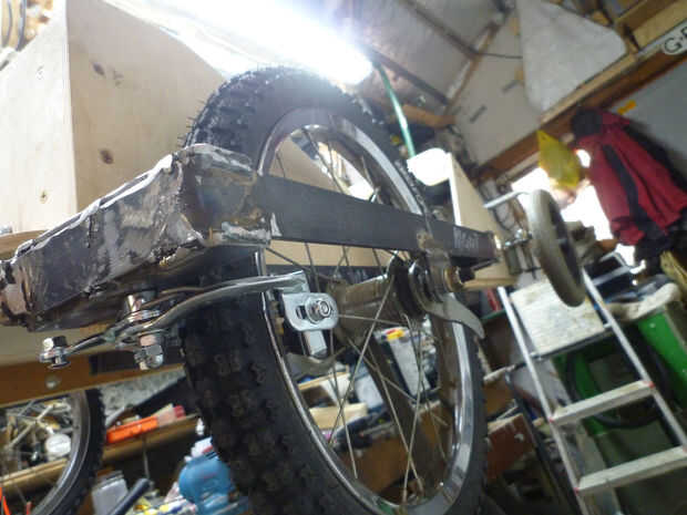 Los mitad-ejes traseros consisten en marcos de soldado con autógena (no estudie mi soldadura muy críticamente - soy un aficionado) de tiras de 30 x 4 mm acero con travesaños de refuerzo y para ubicar las pinzas de frenos. Los marcos incluyen estirones soldados para sostener las ruedas traseras (sacadas la bici de un viejo embroma).