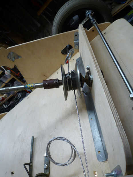 La dirección sí mismo consiste en un tambor giratorio en el cual (al volante) un cable de una barra de dirección delantera es herida, mientras se desenrolla el cable en el lado opuesto del eje delantero. Es muy simple, rápido, con el más viejo niño (Tonička) corriendo a través de la prueba del slalom a fantástica velocidad. Sin embargo es necesario alguna modificación ya que, debido a la naturaleza de la geometría, un cable (en el lado de desenrollar) es flojo en el bloqueo completo. Esto se remedia (relativamente) bien a través de la instalación de una barra de pista conexión izquierda y derecha las barras de dirección. Sin embargo, estoy pensando en usar una caja de dirección de Trabant para el próximo verano. El tambor dirección gira en cojinetes situados en una caja de metal que se fija con pernos a través de las zapatas a la abrazadera delantera. No tengo ni idea de lo que esta vivienda fue originalmente para – probablemente parte de una maquinaria agrícola u otra.
