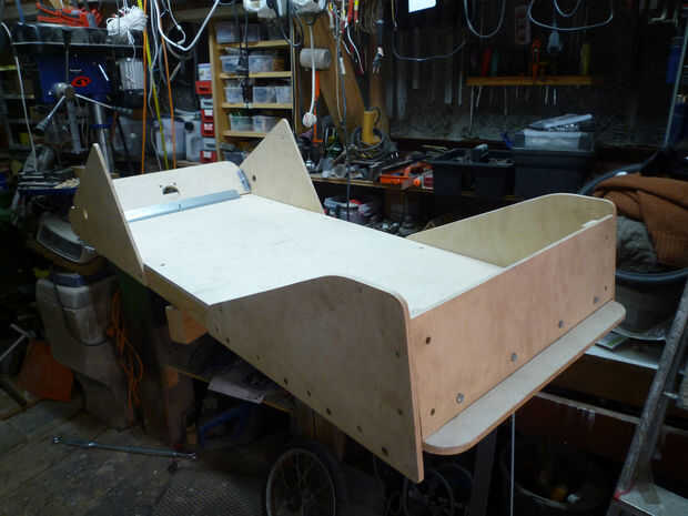 El chasis es un monocasco de madera contrachapada de una hoja de 1350 mm x 500 mm de madera contrachapada de 10 mm. Esto es jodido a dos listones longitudinales de 50 x 50 mm a lo largo de cada lado por debajo. Esta base luego se consolida con tres tirantes transversales de madera contrachapada. La primera, en la parte delantera, toma las fuerzas de torsión del eje delantero y localiza los dispositivos de mando. Puente de la segunda forma el balde (con las piezas laterales triangulares), fortalece la carrocería frontal y apoya la parte superior de la columna de dirección. La tercera, posterior, toma apoyo la torsión las fuerzas de los mitad-ejes traseros, fortalece la carrocería posterior y también actúa como una palanca para empujar el kart cuesta arriba.