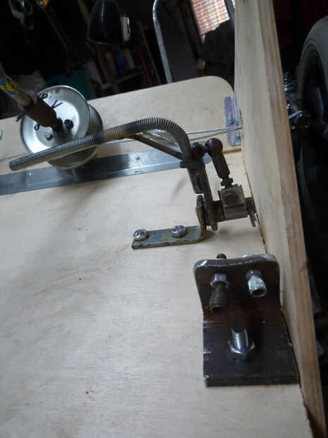 Las pinzas de frenos fueron entre los pocos artículos comprados especialmente para el kart – artículos pasados de moda, baratos y fáciles de montar y configurar. Los cables de ejecutan (de la rueda izquierda debajo del chasis y de la rueda derecha a lo largo del chasis) para el pedal del freno en el piso. El pedal se forma de varios pedacitos y pedazos de chapa, acoplamiento de una bomba de diesel tractor viejo, etc, etc.. Hay un apoyo de pies atornillado al piso a la izquierda. Esto se hace de un trozo de chapa galvanizada doblada.
