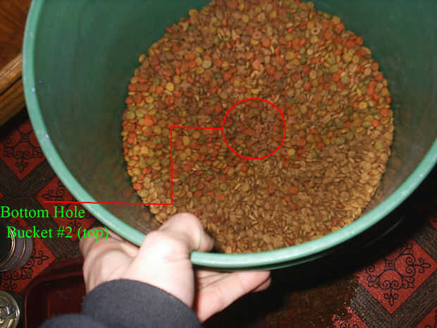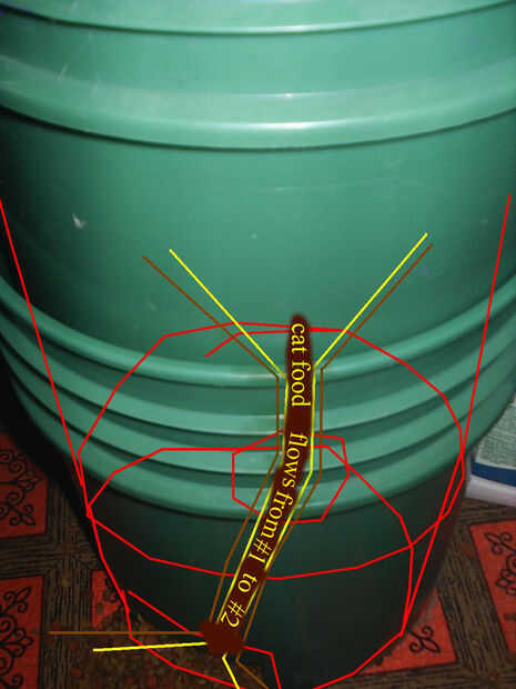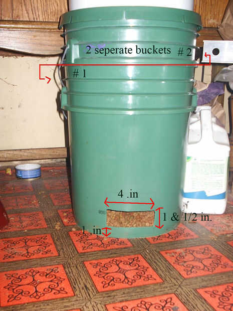 El principio de esto es simple, haga un agujero en el cubo superior para una cantidad controlada o flujo estrangulado de la comida para correr en el cubo inferior que puede ser rastrillado hacia fuera a través de una puerta en este cubo también permite alimentarse libremente mi gato