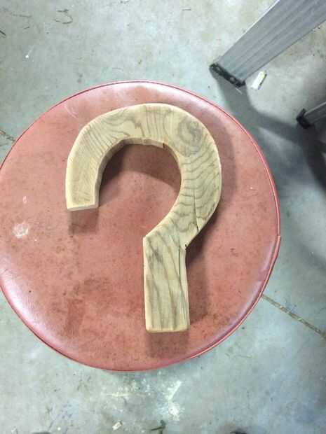 Iba de una imagen que saqué de la intro. Decidí comenzar con el "?". Para ello, dibujaba en una tabla de ancho y cortar con una sierra de banda. También lijar y alisar con la lijadora de banda.