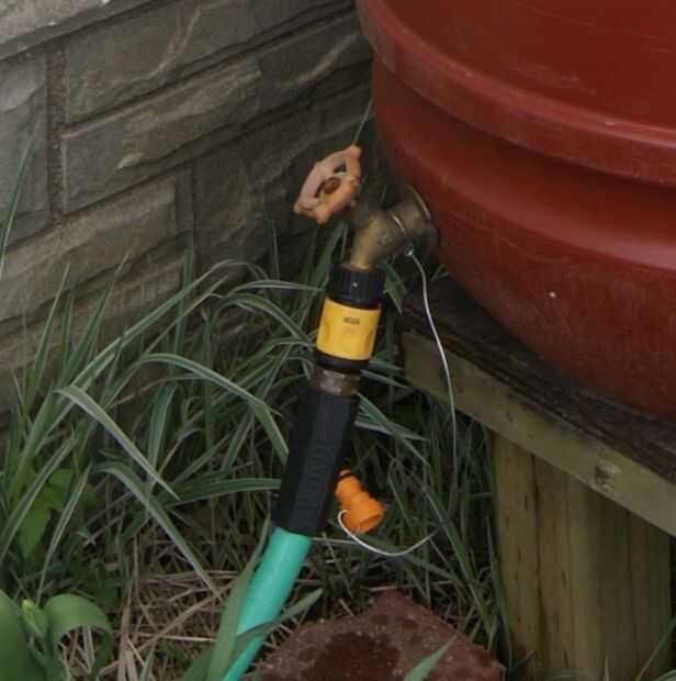Desde que uso el agua de lluvia en cada barril en dos zonas ajardinadas, uno cercano y uno lejano, necesito desconectar y reconectar la manguera bastante a menudo. En lugar de Desenroscar y enroscar la manguera cada vez, he instalado una conexión rápida a la espita. Tiene una parada que se cierra cuando se desconecta la manguera. Un repuesto conector macho sin una manguera de conexión abrirá la parada para que corra agua en una regadera.
