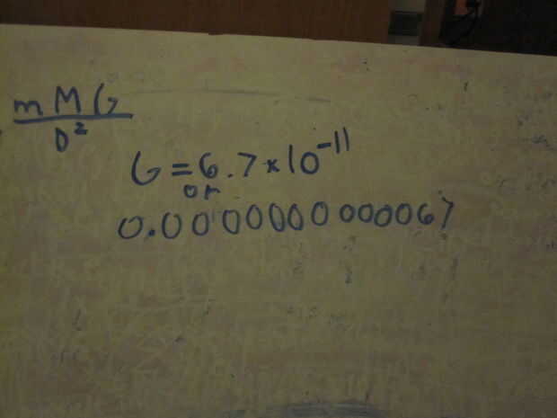 -11). Es un número increíblemente pequeño, que significa que si tuvieras dos objetos un medidor aparte pesa un Kg cada uno, no habría ninguna notable fuerza gravitacional entre ellos. Sin embargo, es uno o ambos de los objetos implicados tiene una masa muy grande, usted comenzará a obtener un efecto notable.