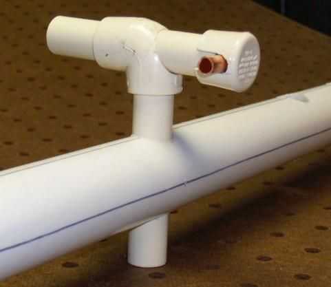 Diseñado mi antena con una recta NAROD, pero construido en disposición para probar las varias formas y tamaños de tophat NARODs. La foto muestra cómo se puede perforar un codo estándar de 90 grados a través de hacer un soporte ajustable. Se puede deslizar hacia arriba y hacia abajo y hacia adelante y hacia atrás, luego cementado en su lugar para acomodar cualquier tophat. Un casquillo de la pipa modificada limita el tophat, simulado en la foto por un tramo corto de tubería de cobre.