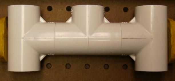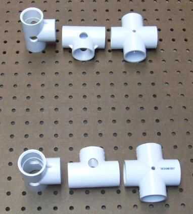 Accesorios de PVC hay que taladrar en lugares precisos. Sus marcas de molde (mejoradas en las fotos con lápiz) ubicar sus centros en un eje, y las marcas de molde de dos conectores iguales pueden utilizarse para encontrar el centro de una t en el otro eje. Perfora el centro para ayudar a iniciar un ejercicio, o si el agujero tiene que compensarse desde el centro, el desplazamiento se mide y que lugar perforado. Yo Marque el punto en ambos lados de una conexión y ambos lados del taladro, en lugar de perforar a través de un lado. Dos tes pueden fijarse para que una regla puede marcar el centro de la t media en su otro eje, y lo mismo puede hacerse para marcar el centro de una conexión cruzada. Un pedacito de forstner es rígido y tiene un punto agudo, por lo que se iniciará en la marca de golpe sin que vaga en la superficie curvada.
