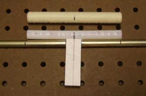 Para los reflectores de dos piezas, utilice un bloque del ancho especificado para la brecha entre las dos varillas y su centro marcado. Alinee el bloque con el centro de lo PEX y marque las barras a las afueras de los extremos de lo PEX. Es una buena idea marcar el centro del CPVC así y marcar en ambos lados de su centro por lo que será posible confirmar que se centra en el tubo de columna de PVC de la antena cuando finalmente se instala. El espaciado de estas marcas depende del diámetro del tubo de columna vertebral de la antena.