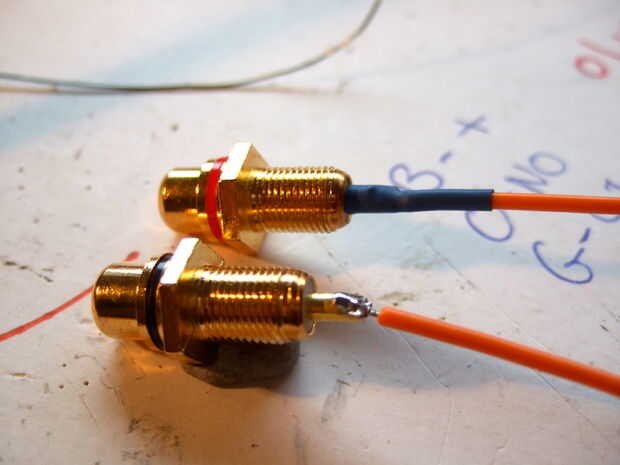 Los cables de los conectores RCA de Fem de L & R ir al conector azul + y -