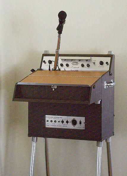 Merodeando por los mercados de pulgas y ventas de yarda, pude gorronear, reparar, modificar y armar un sistema viable. Los altavoces estaban equipados con asas resistentes, así como bases de montaje Tornillo a colocar sólidamente en trípodes de cámara modificada. Antiguo ghetto blasters eran reparados y reinstalados para funcionar como amplificadores de audio campo de clase de 12VDC alto voltaje A-B. Edad de salida ciclo profundo, baterías de plomo de mi vehículo eléctrico ligero, eran más que Bienvenido al nuevo sistema, donde carga amp probado y dado una designación revisada de Ah bajada y luego equipados con robustas asas de transporte.