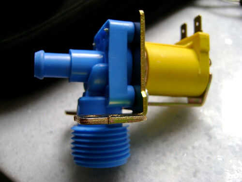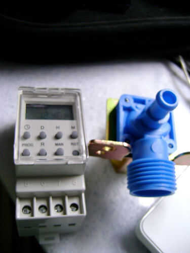 EU comprei algumas válvulas se utilizam em máquinas de lavar roupa, para una entrada de água no sistema. Custaram cerca de US$ 5,6 cada uma. Cada válvula dessa ficaria conectada ao meu "regadera" feito a mão. Una cisterna de na del água é capturada, bombeada é até una caixa de água e depois desce para um ramal que segue