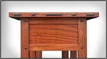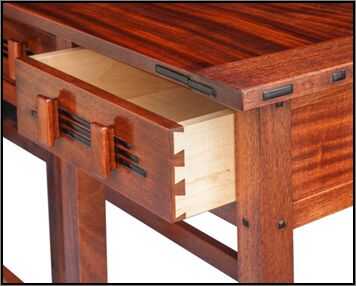 La huella de esta tabla es 12 1/2" de profundidad y 53 5/8" de largo. La parte superior sobresale en todos los lados y mide 16 ¼" profundo y 56 5/8" de largo. La tabla incluye tres cajones. La mejor caoba disponible hoy en día es de Honduras y se conoce como "caoba genuina". Es caro y funciona entre $10-15 a pie del tablero y puede ser difícil de encontrar. Caoba africana está más fácilmente disponible y es más barato ($6-8 a pie de tablero), pero es más difícil de trabajar y es generalmente un poco más oscuro en color y es más propensa a granos rasga-hacia fuera.