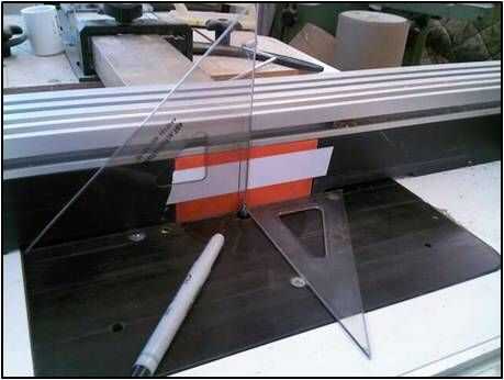 Con la valla detrás sobre ¼" de la broca, coloque un triángulo plano sobre la mesa y la plaza a la guía de la mesa de fresadora. Muévalo de un lado de la broca. Tomar el otro triángulo y ponerlo contra el triángulo plano para colocar una marca vertical en la cinta.