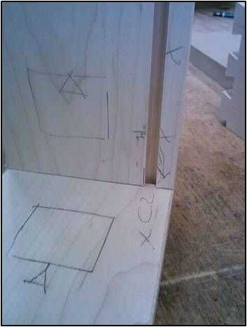 Montar cada cajón y marque la ubicación de la ranura en la parte posterior. Debe ser alrededor de ½" pero puede variar un poco. Una medición precisa es importante para asegurar un buen ajuste apretado.