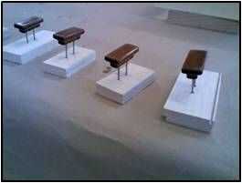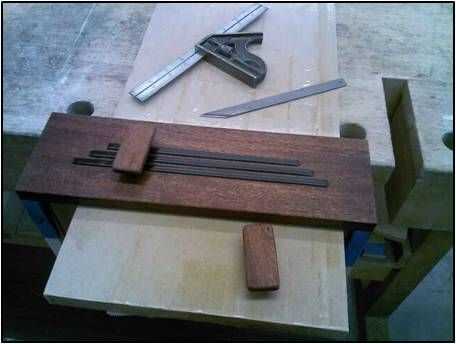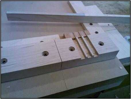 Las incrustaciones son alrededor de ¼" de amplia y espaciada 1/8" de separación. La plantilla tiene 3 ranuras de corte en un bloque de arce. La extracción se lleva a cabo en lugar de 3 lados. El Departamento de los surcos son de 1/16".