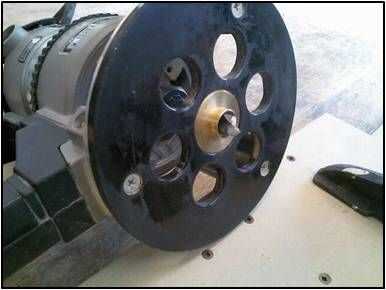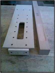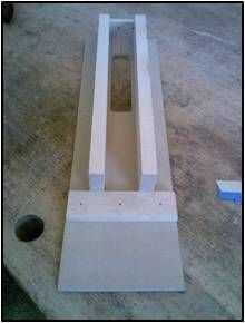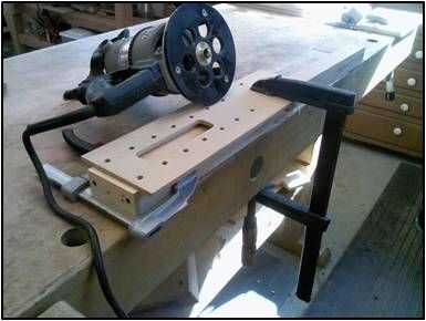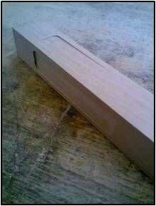Hay un bloque de ¼" set 12" desde el borde de la plantilla. Este bloque eleva el extremo de la plantilla. Esto producirá un corte slopping que se funden en la parte superior de la bolsa de pierna. La pierna se adapta a la plantilla entre los dos topes-guía set 1 ½" apart. Atornillar un bloque de tope en el extremo que se registra al final de la pierna para que cada hueco se coloca la misma.