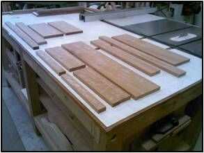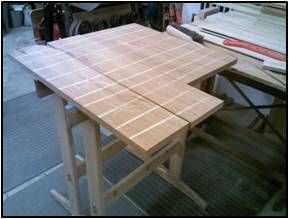 Arriba: La parte superior es aproximadamente 16" de ancho por lo que tendrá 2 o 3 juntas al pegamento del borde para alcanzar 16" ancho. Los tableros deben ser unos 5' de largo. Color y el grano partido es fundamental ya que la parte superior es el punto culminante de la tabla. También se debe de seleccionar piezas de grano recto de los extremos de dos protoboard.