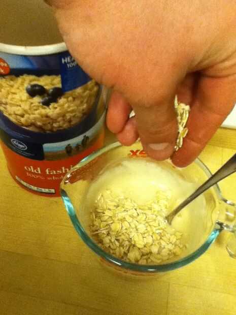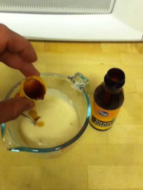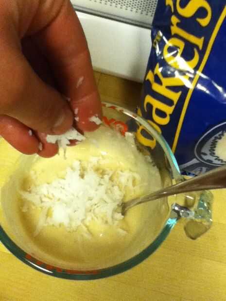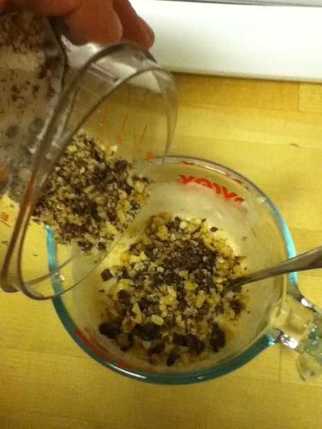 No medir nunca, así que, sólo hay que poner alguna mezcla de pancake (aproximadamente 1 taza) en un recipiente. Luego agregar agua al espesor deseado. Agregue una tapa llena de extracto de vainilla. Añada aproximadamente la mitad de una cucharada de protien y agregue más agua hasta consistencia correcta. Añadir coco, avena, nueces picadas y chispas de chocolate a su gusto.