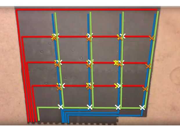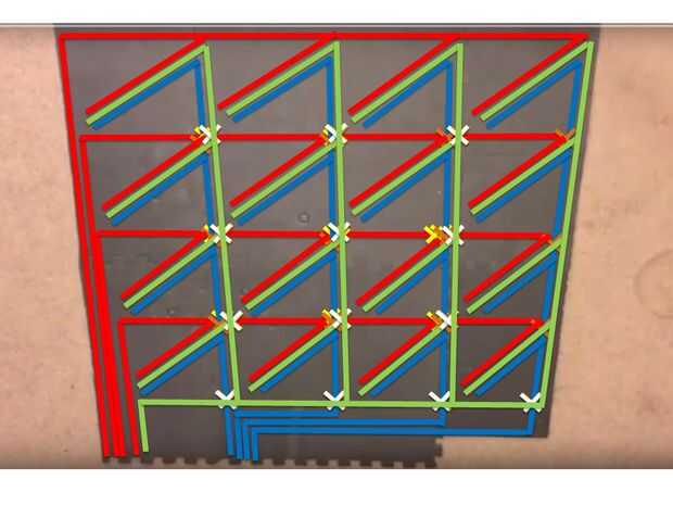 Completan la red conectando las piezas diagonales con la horizontal en la parte superior, toma de tierra en el medio y vertical en la parte inferior. Coloque la cinta de enmascarar con cuidado y utilizar la técnica de plegado de video del paso anterior.