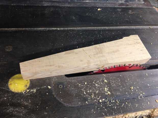 Primer paso es áspero hacia fuera la madera. Fui con una manija triangular con una base lo suficientemente grande como para acomodar el inserto roscado. Utiliza una sierra de mesa con una plantilla para cortar las porciones angulares continuación, completa los bordes con la escofina sureform. Ya que utilicé una pieza de dimensiones 2 x 4, corte los ángulos antes de cortar a la longitud en un esfuerzo por mantener las manos más lejos de la lámina.