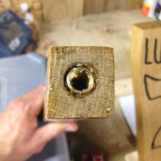 En la parte inferior de su empuñadura, perfore un orificio de 1/2" para alojar el casquillo de latón. Usé un taladro mientras que el mango era un vicio pero una prensa del taladro, probablemente sería un poco más precisa. Lo hice inmediatamente después del desbaste hacia fuera de la manija, porque he leído sobre el mango partir al insertar (no quería hacer el camino y luego romper el mango). Era muy difícil torcer en pero nada roto. Si alguna vez hago otro que lo haré probablemente utilice una broca de mayor tamaño y aplique un poco de pegamento al exterior de la estufa para asegurar en su lugar.