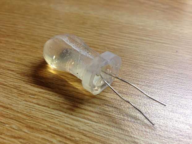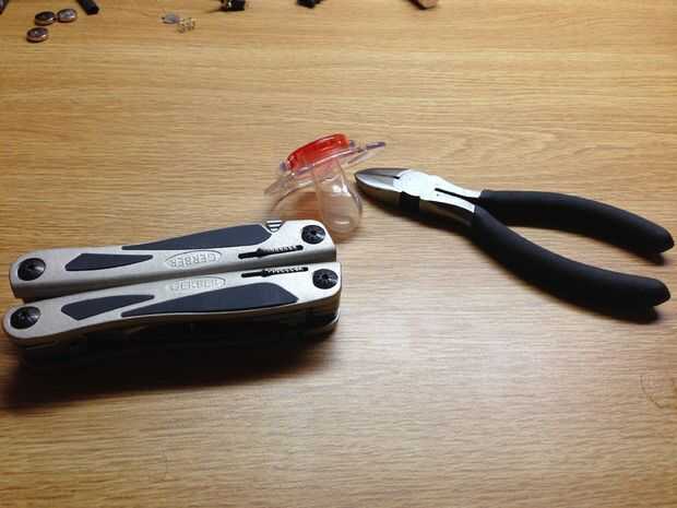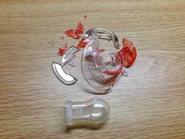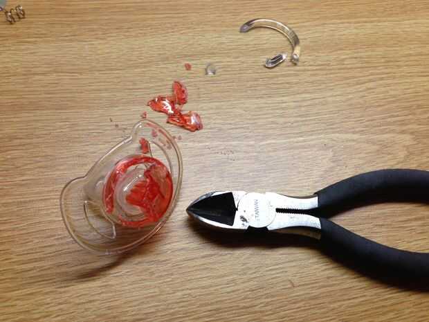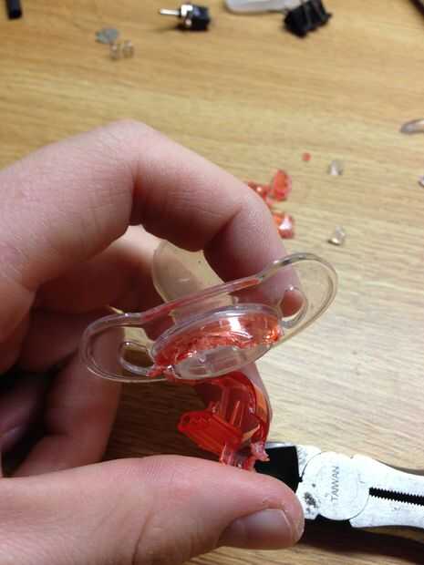 Inicio con el chupete el destruir por cualquier medio necesario, usé cortadores de alambre y mi herramienta multiusos para realizar la tarea. Esto va a tomar tiempo y paciencia. Una vez que la parte de "pezón" está libre, haga un corte hacia abajo de un lado para que pueda añadir pegamento caliente a la forma entera. Abra las aletas y agregue cuidadosamente el pegamento, luego cierre las aletas, algunas del pegamento se filtran hacia fuera pero solo puede recortar más tarde. Entonces necesitará rápidamente Deslice el LED en allí y dejarlo sentarse y firma para arriba.