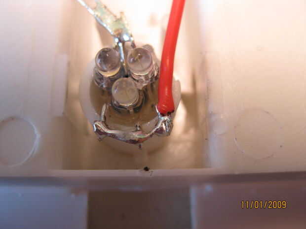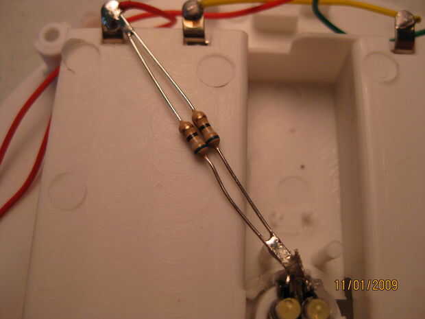 Para este paso fácil, sólo tenemos que conectar la ficha de soldadura de la batería a nuestras resistencias y resistores al final de nuestros LEDs ánodo. Luego que soldar un cable a los cátodos de los LEDs para su uso posterior.