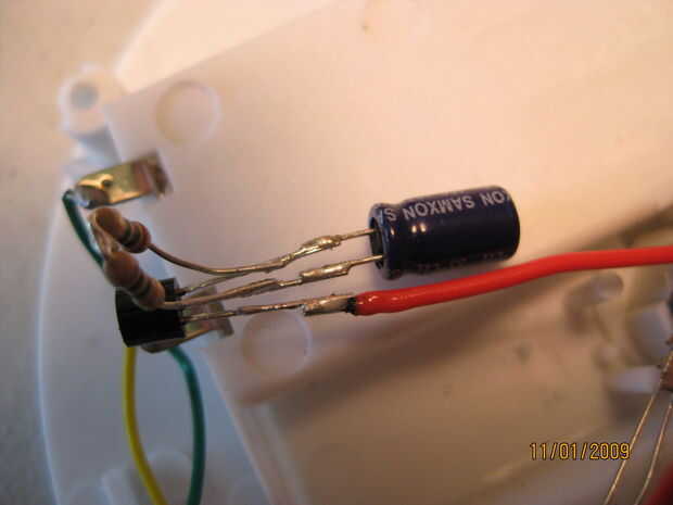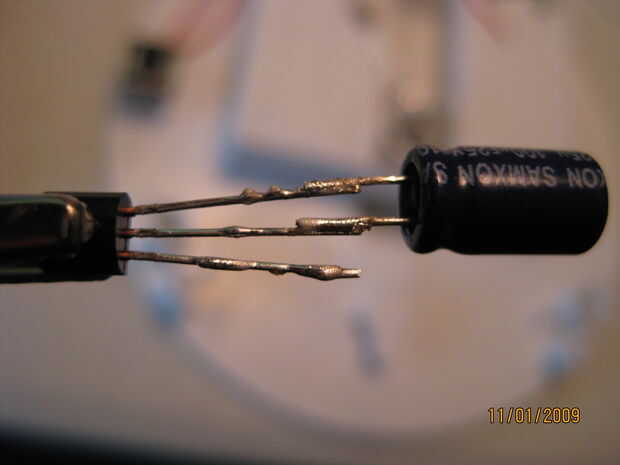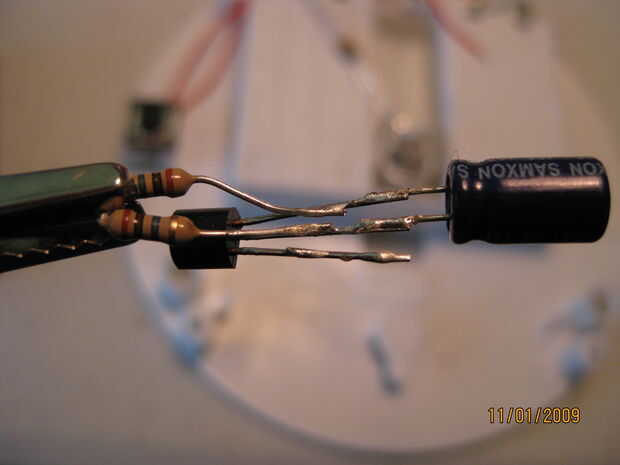 1. Conecte el mosfet a y condensador juntos. He recortado un poco la longitud de las piernas en el condensador y estañado previamente las patas de todas las partes. Asegúrese de que la pata negativa del capacitor está conectada a la pata de la fuente de lo mosfet y la pata positiva del capacitor a la puerta de lo mosfet. (imagen 1)